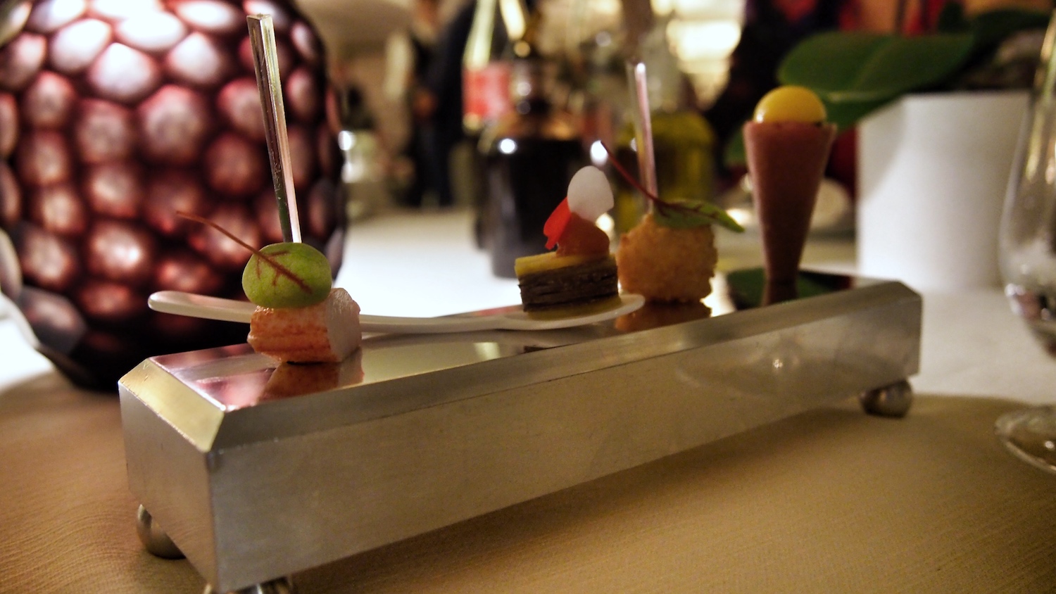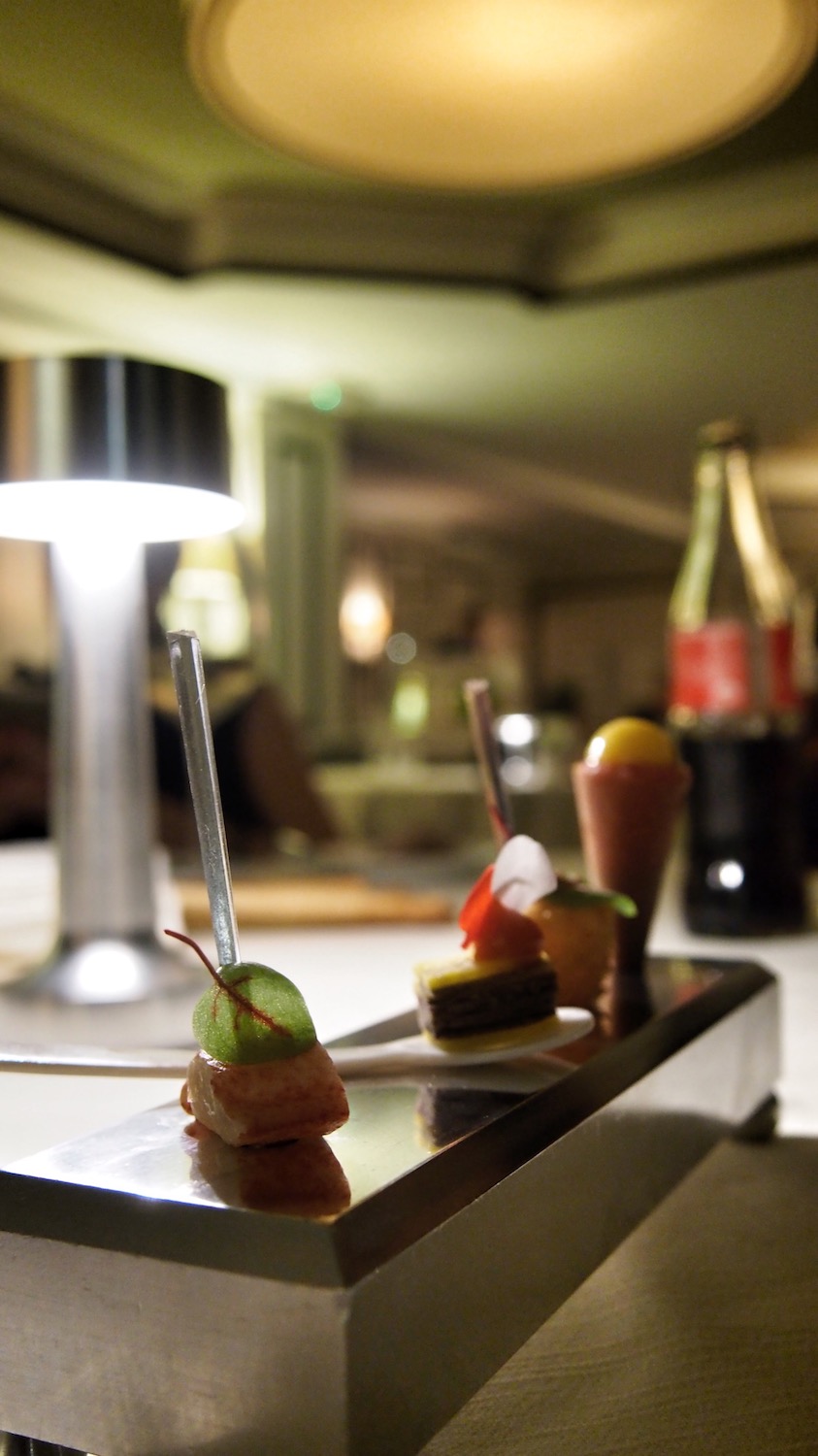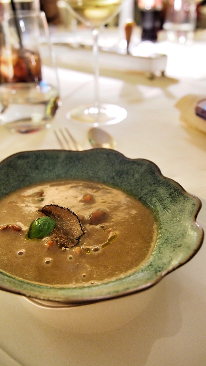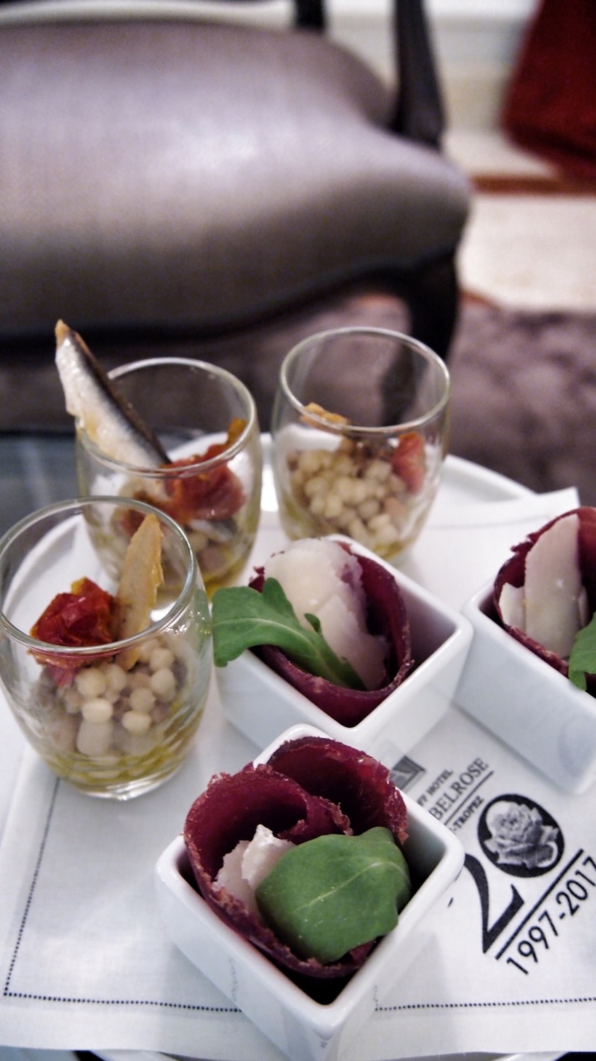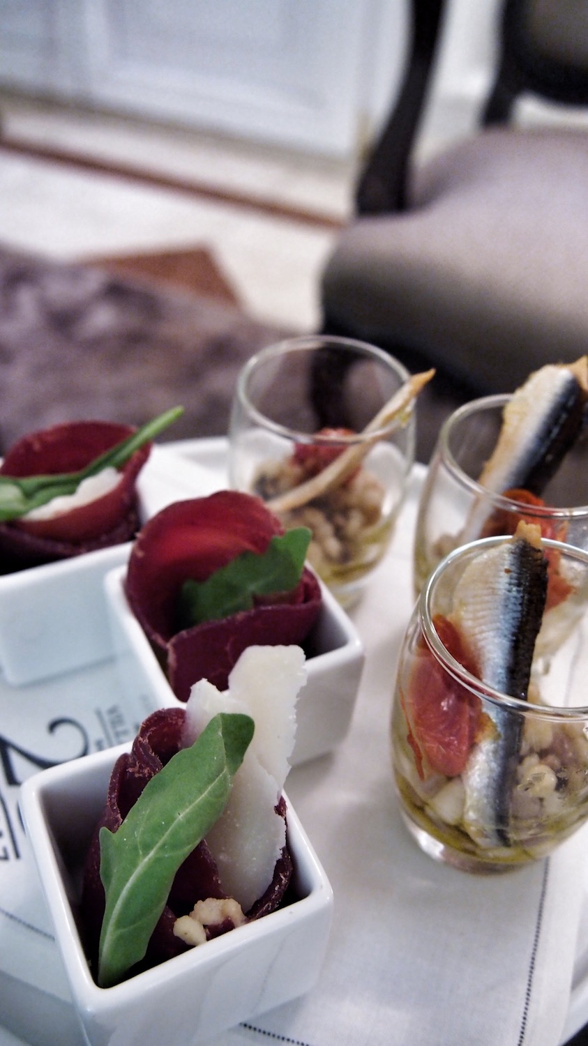 Le premier soir, on nous avait prévu un apéro dinatoire. Nous pensions donc grignoter des petits fours, de la charcuterie, des olives … Que nenni ! (oui j’aime bien cette expression désuète). Nous avons eu droit à un vrai repas que nous avons dégusté confortablement installé dans le salon de l’hôtel.