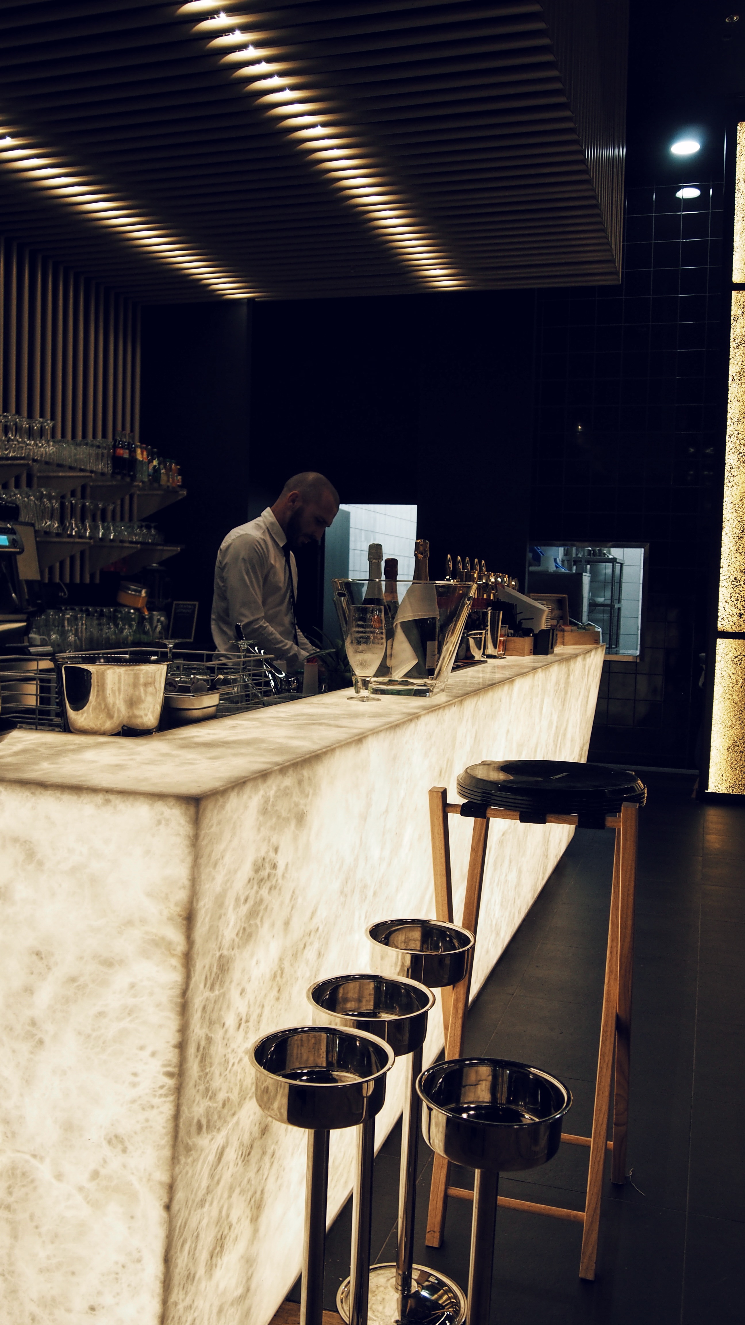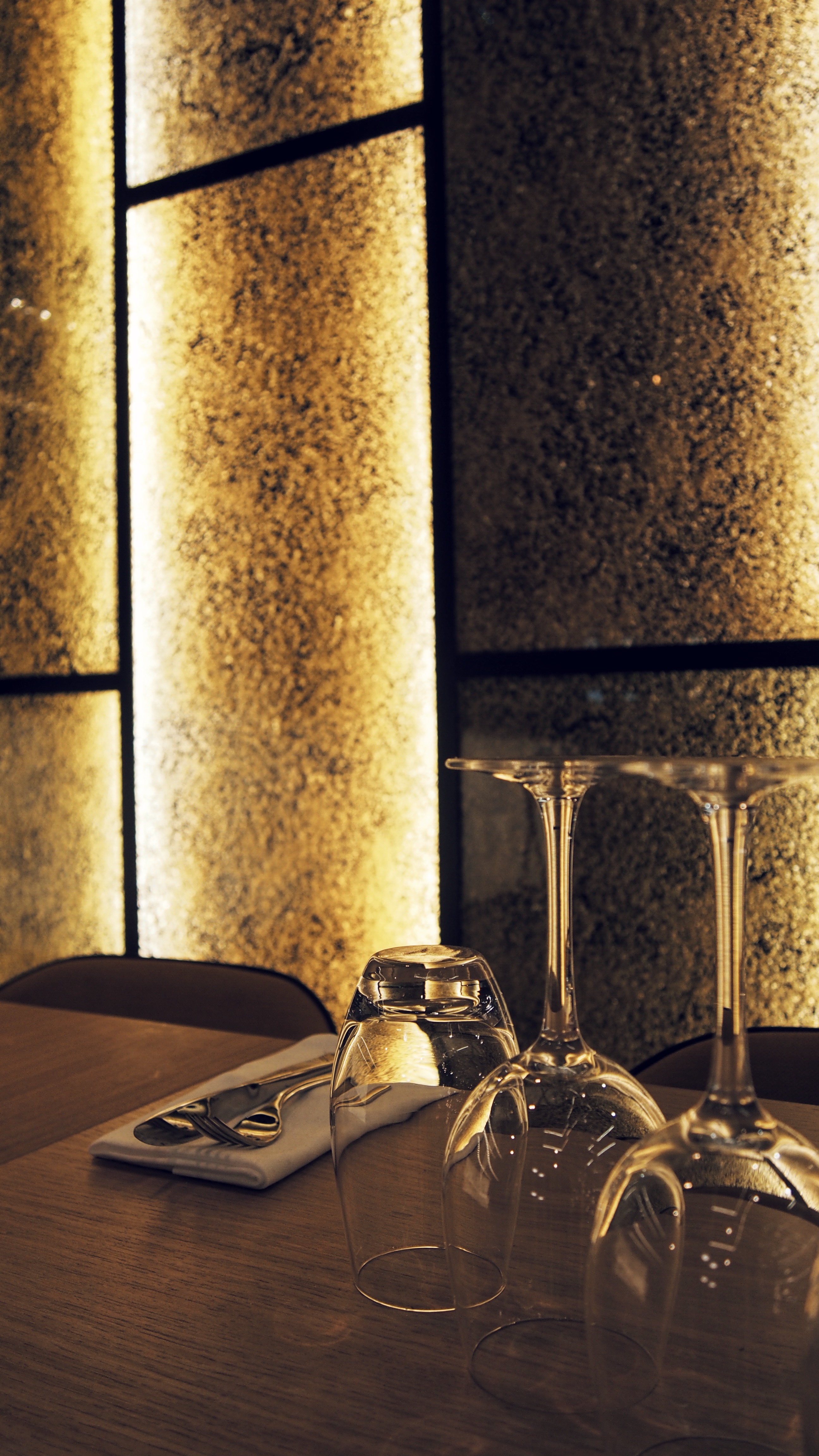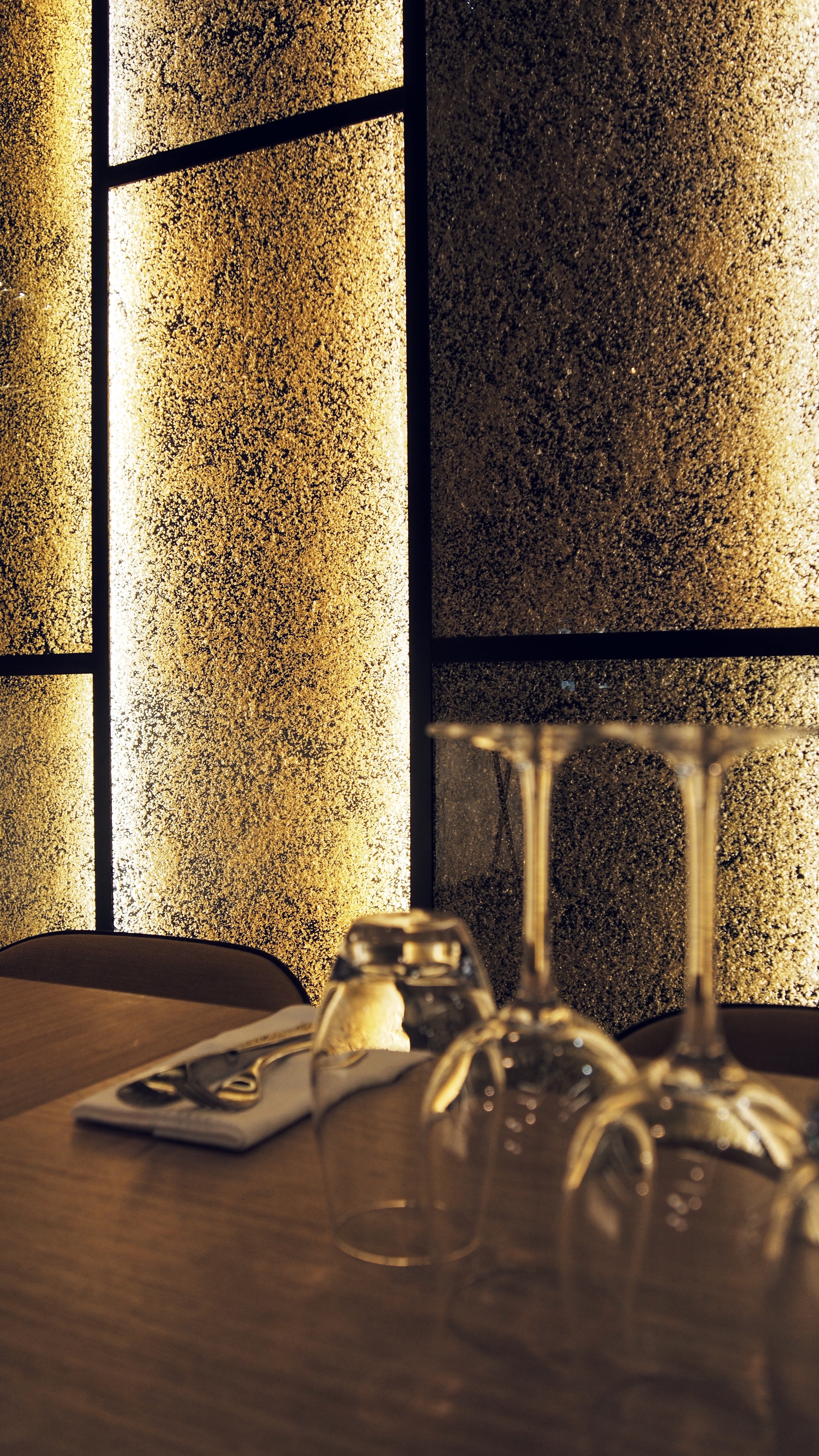 En rentrant dans le restaurant, j’ai été instantanément séduite par la décoration. Un énorme coup de coeur pour le bar en albâtre ! Illuminé, sa texture m’a fait penser à la surface de la lune, tout simplement sublime. Et le mur en feuilles d’or apporte également une touche de luxe tout en raffinement et crée également une atmosphère particulière.