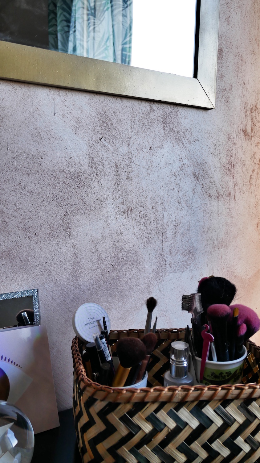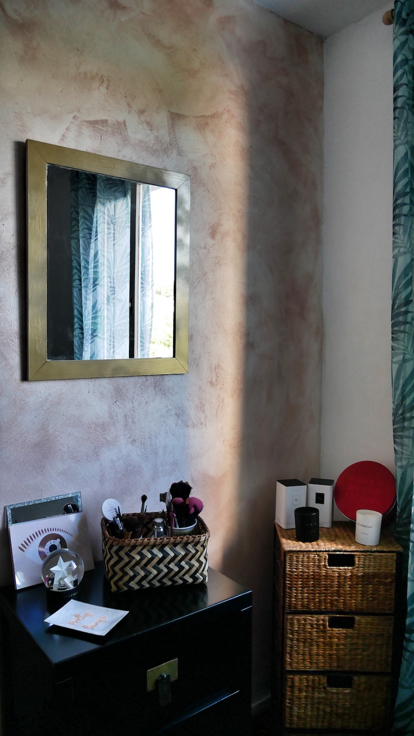 Au niveau des couleurs de cette pièce, j’ai eu envie de partir principalement sur du rose (un pan de mur), du vert (un autre pan de mur + déco) et du doré (déco).