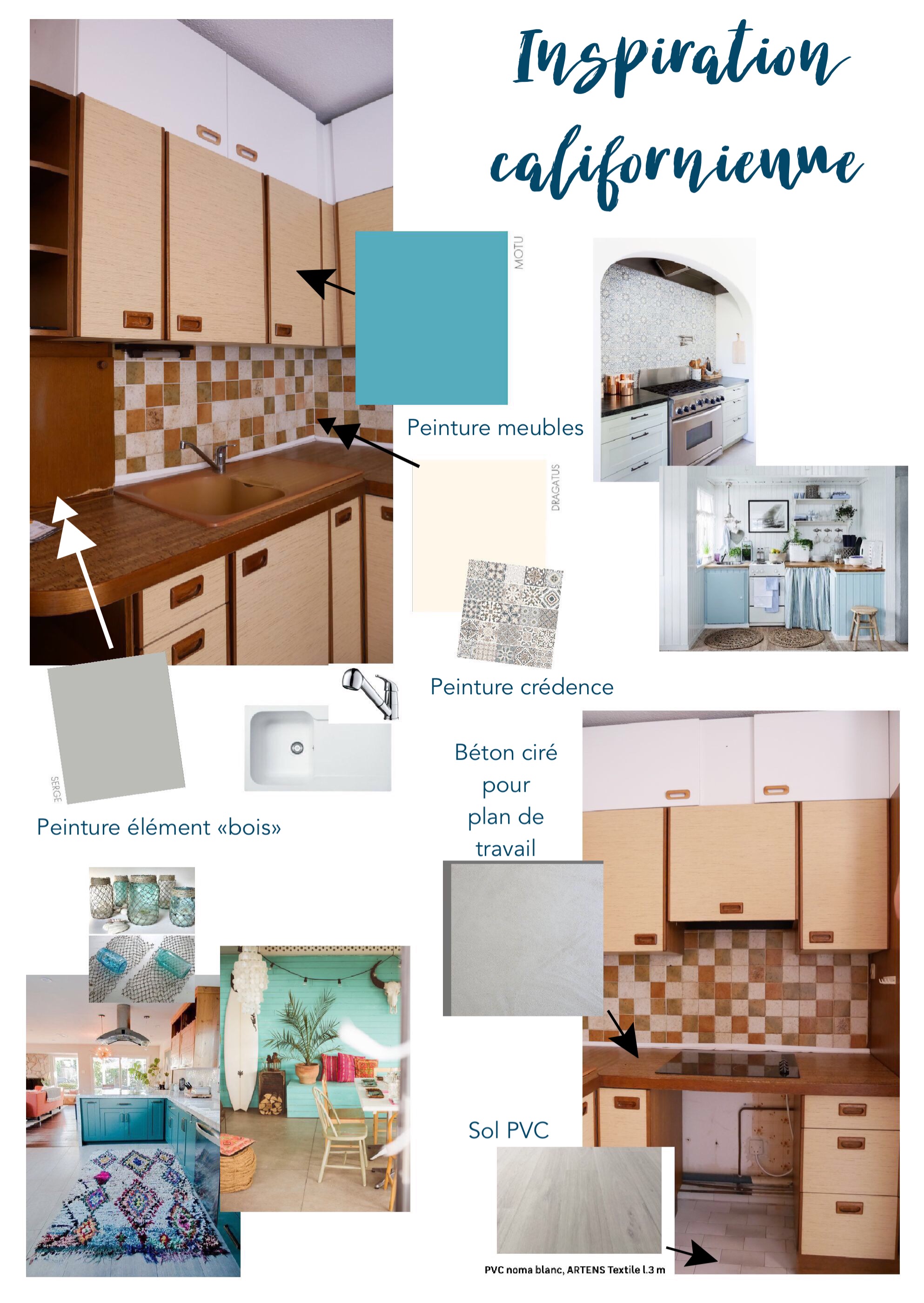 Cuisine : Inspiration californienne, un petit côté bord de mer avec une dominante de bleu. Nous devons composer avec les meubles déjà présents, nous les avons donc customiser en les peignant.