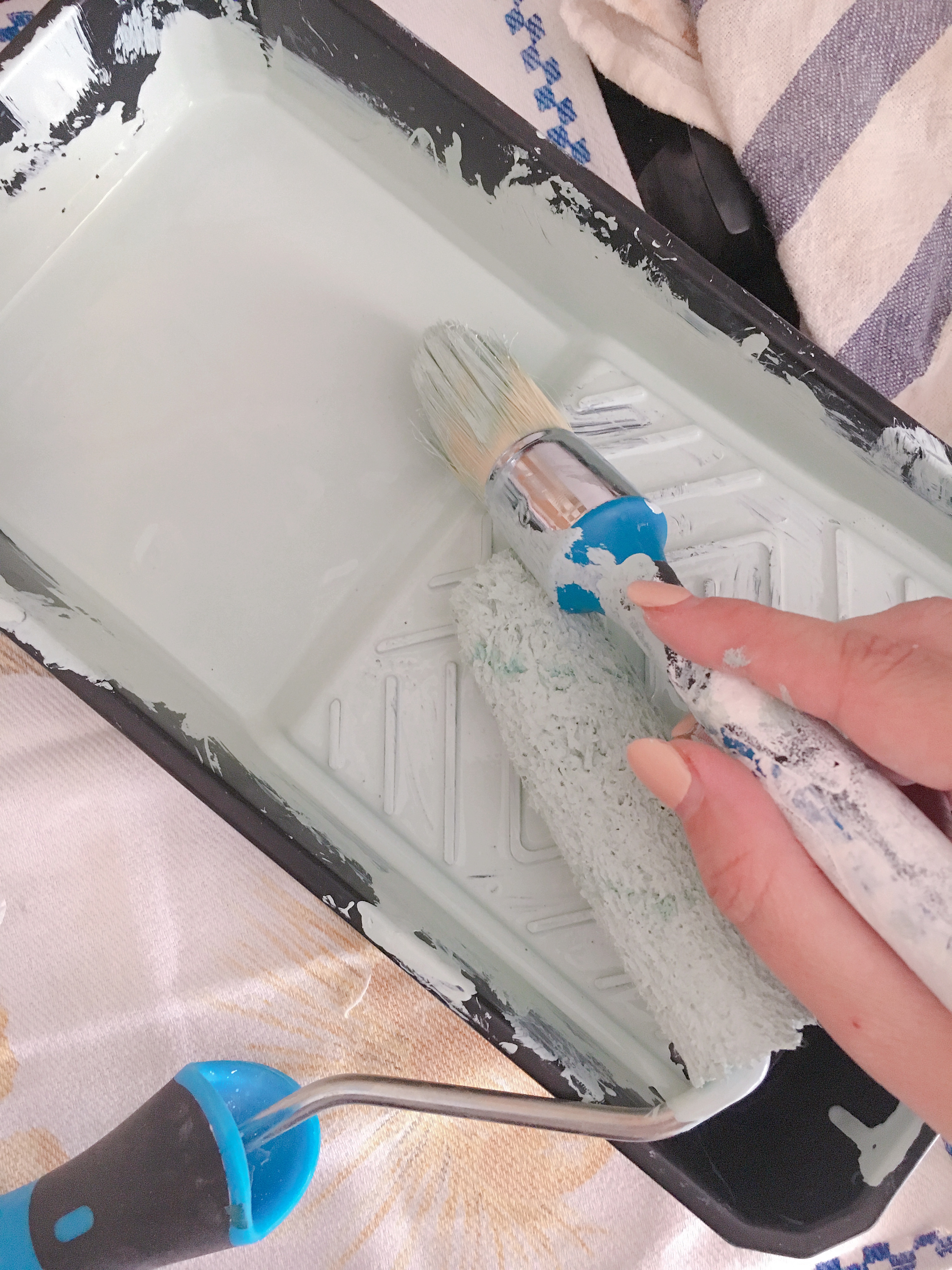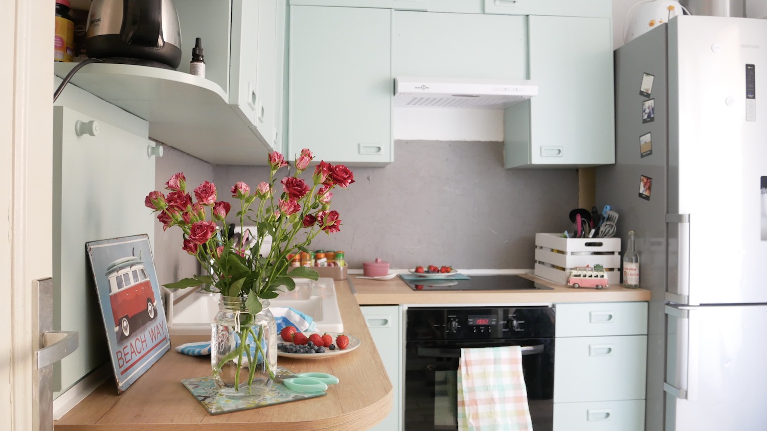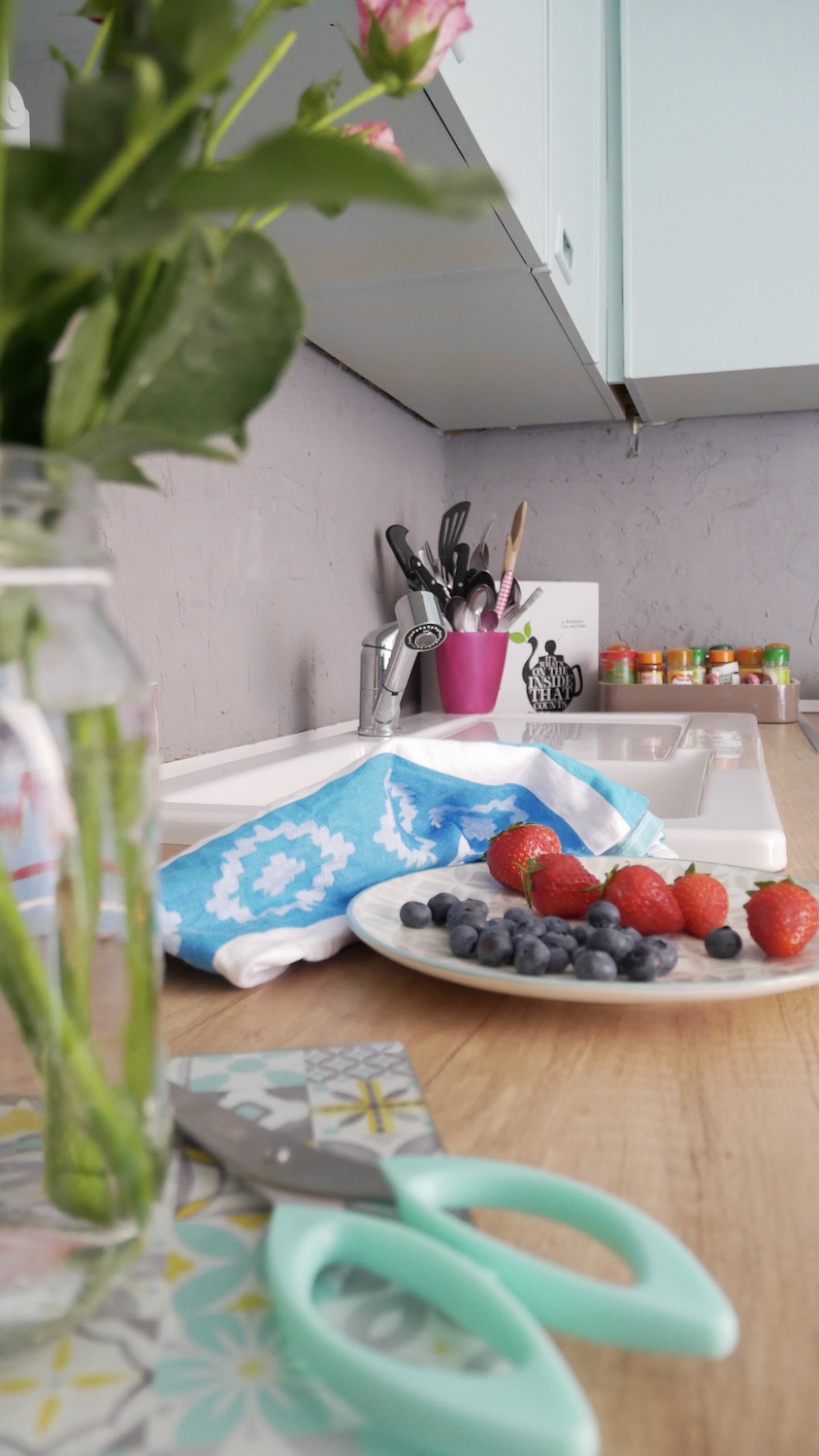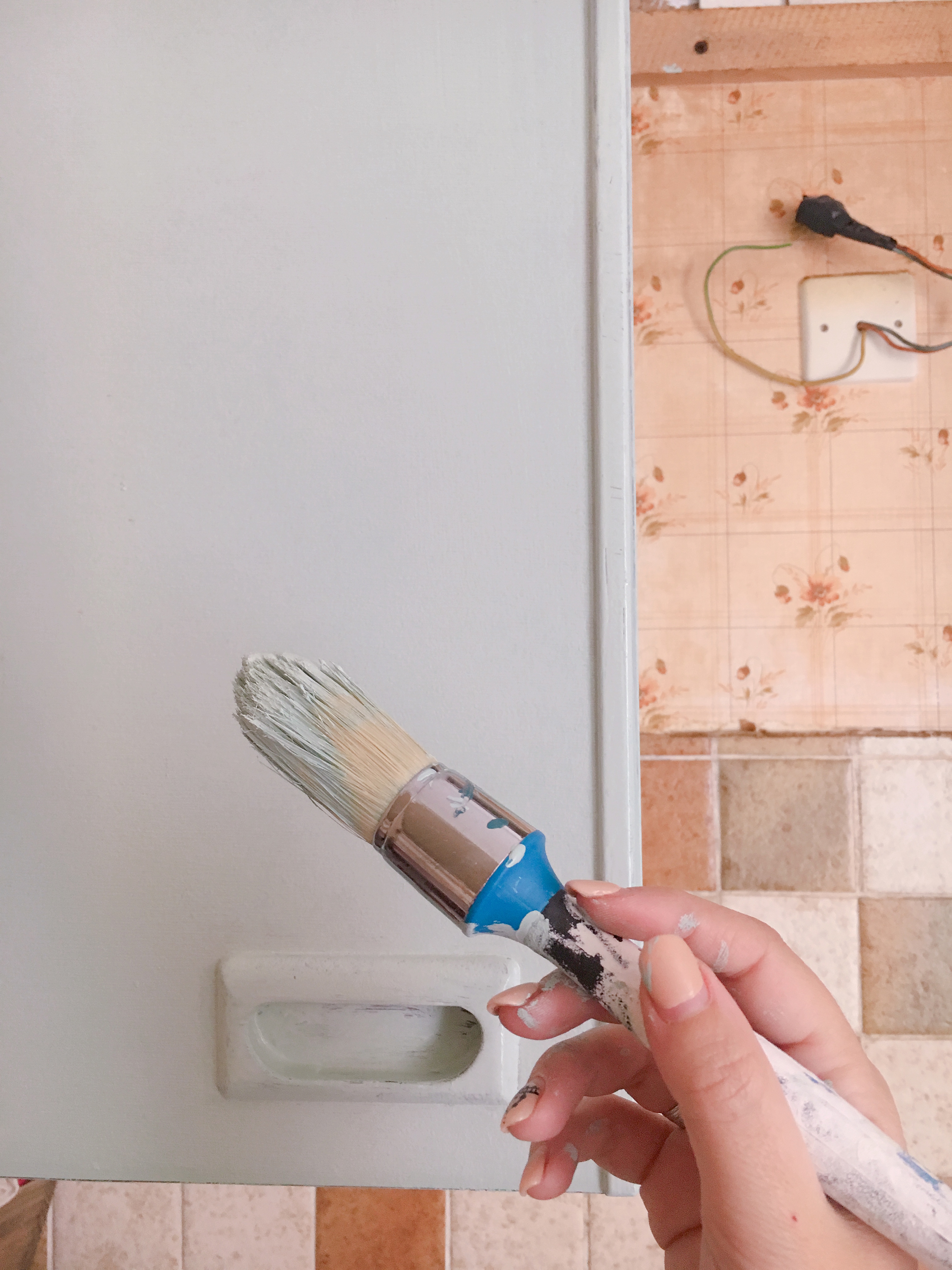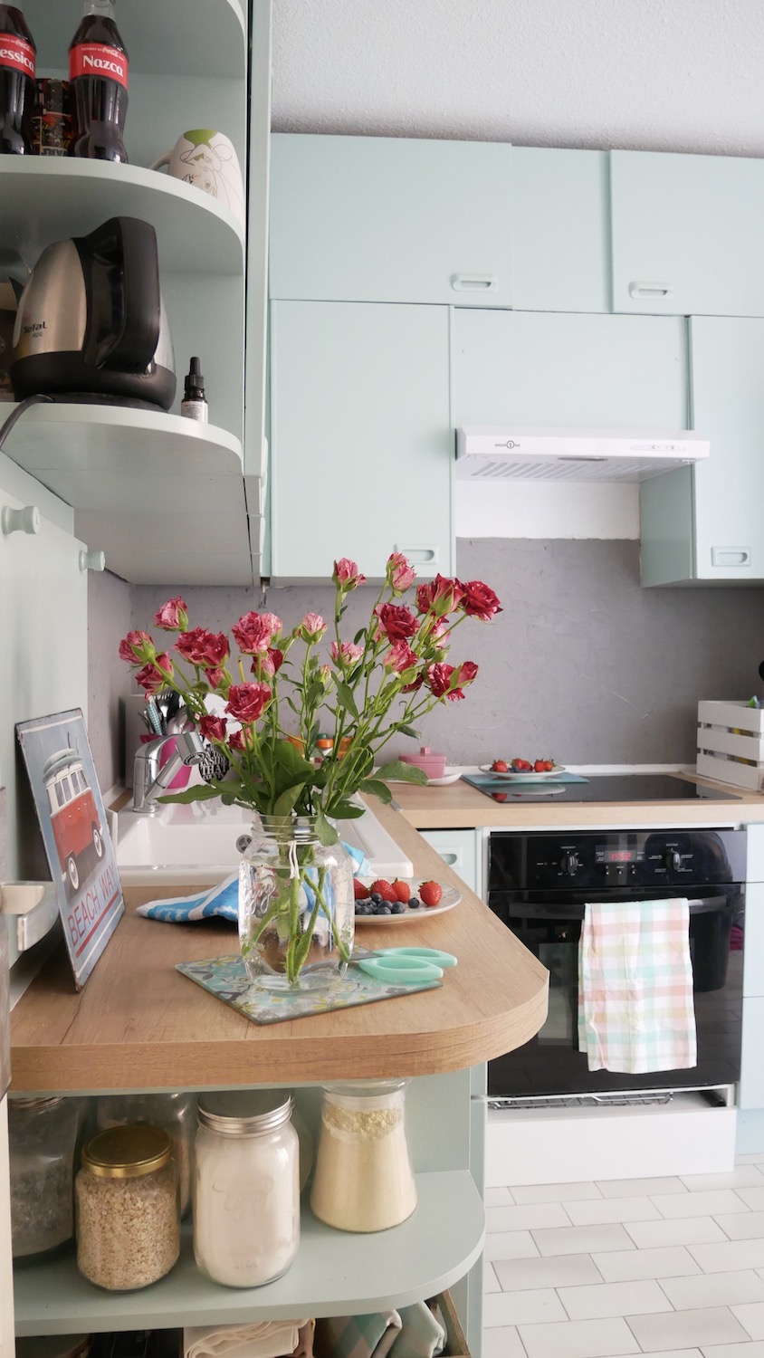Nous avons choisi de repeindre les éléments en bleu avec une peinture spéciale pour les meubles se trouvant dans les pièces d’eau. N’ayant pas trouvé notre bonheur au rayon cuisine, c’est dans celui de la salle de bains que nous avons déniché la teinte parfaite : un bleu très doux et surtout lumineux.