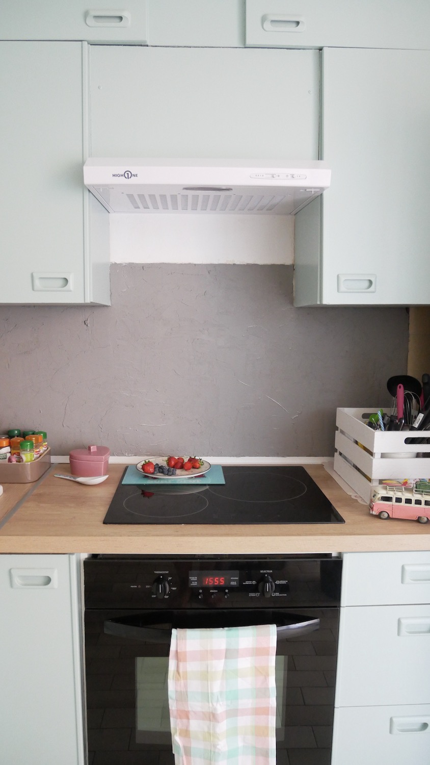 Nous avons également décidé de faire des économies en ne changeant pas la crédence mais en utilisant de l’enduit décoratif effet béton qui apporte une touche industrielle qui change un peu.