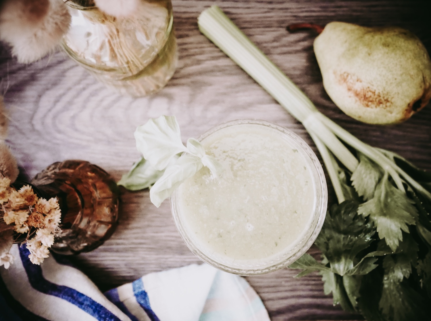 Pour ce jus, j’ai utilisé le dernier basilic frais que j’ai pu trouver car malheureusement la saison est terminée, le fenouil pour le côté anisé et le céleri pour tout ce qu’il apporte de positif au corps. La poire ajoute une touche sucrée tout comme l’orange.