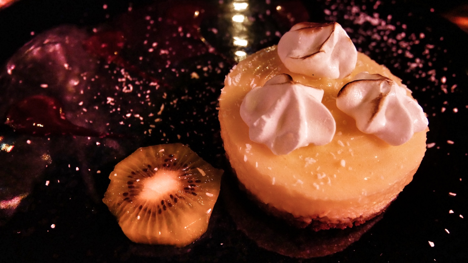 Pour finir : choux à la crème mousseline sauce chocolat, coco râpée et tarte au citron meringuée coco râpée, lit de speculoos, coulis de fruits rouges.
