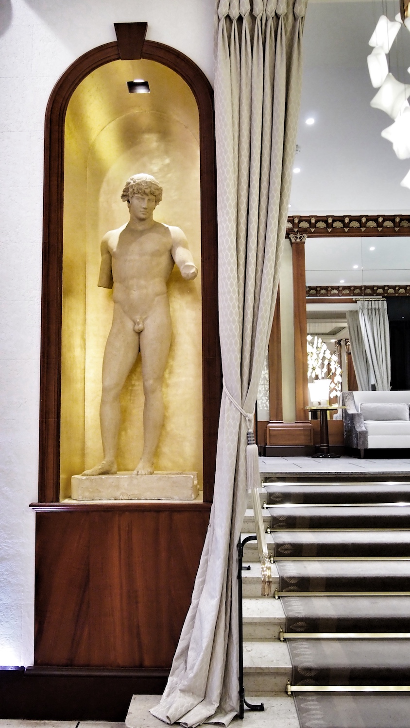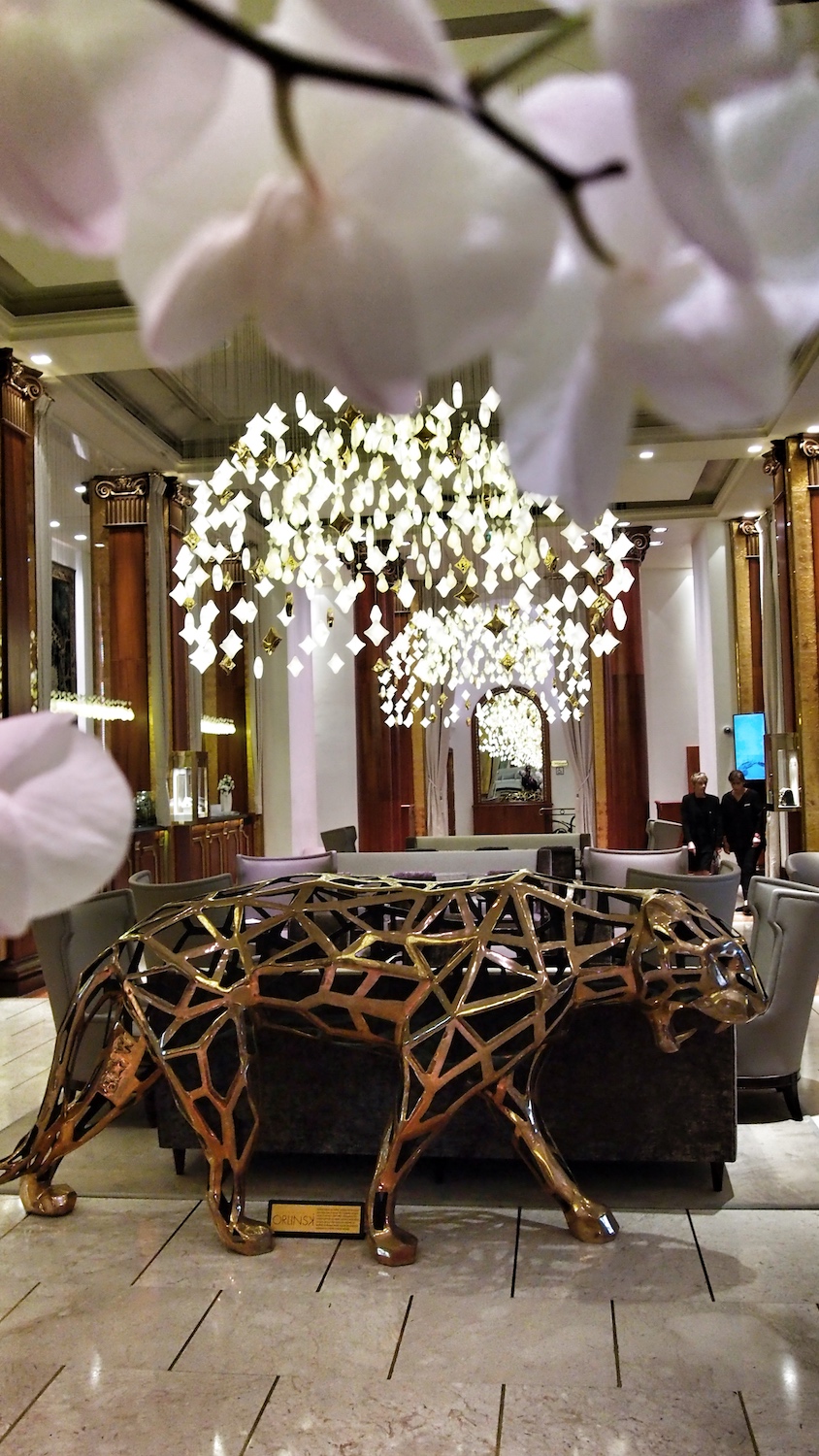 Le décor est raffiné avec une touche de modernité. C’est d’ailleurs une oeuvre de l’artiste Orlinski qui nous accueille dans le hall d’entrée, un tigre de métal qui trône fièrement au milieu de l’élégant mobilier.