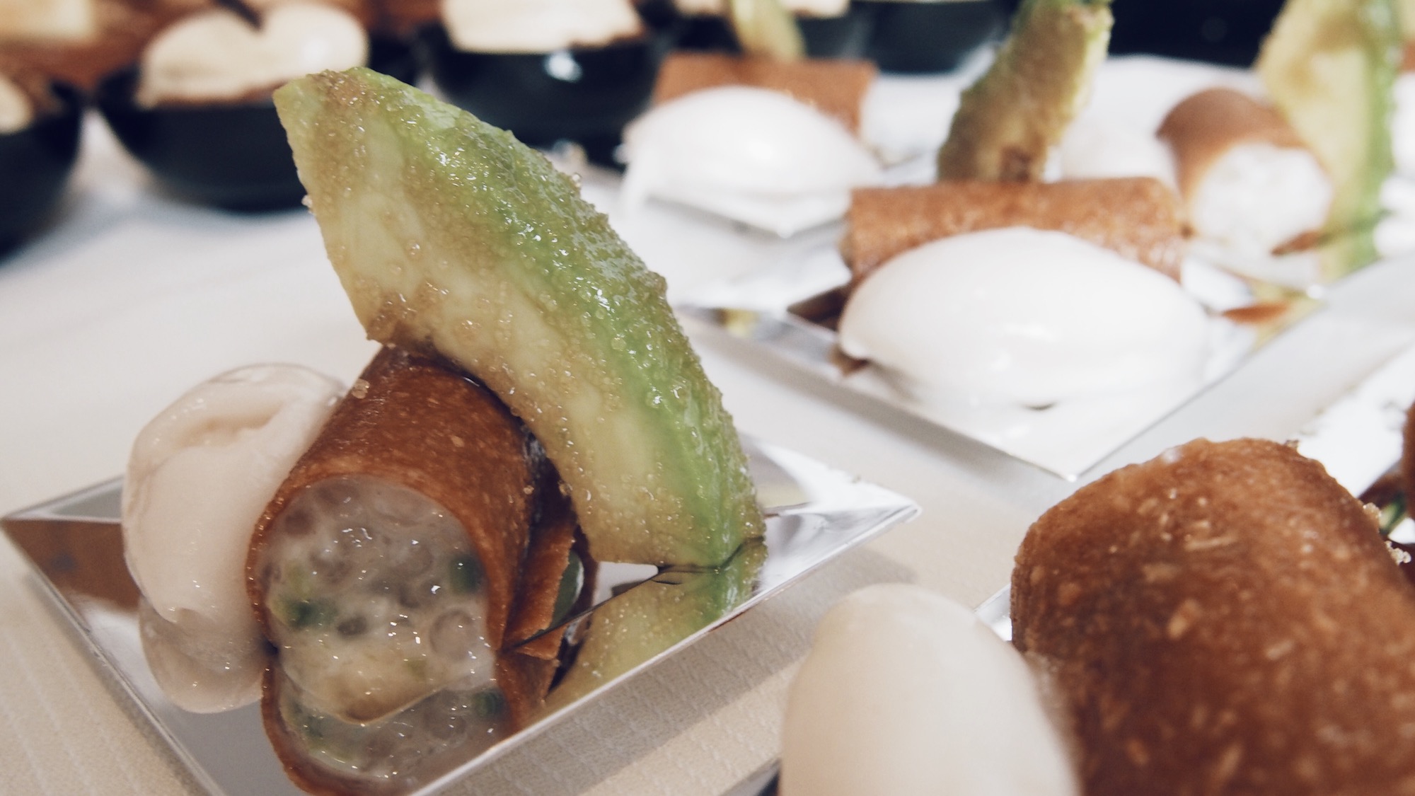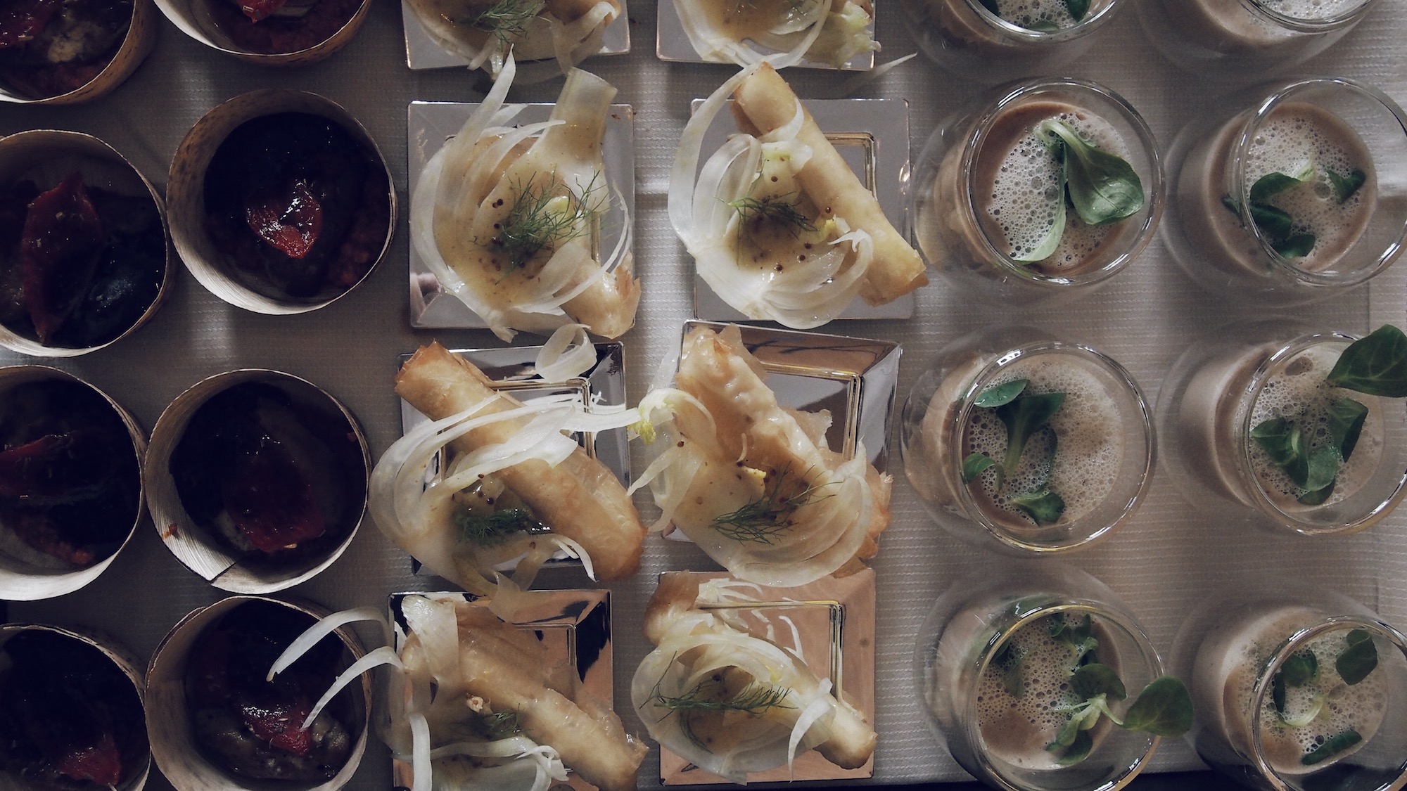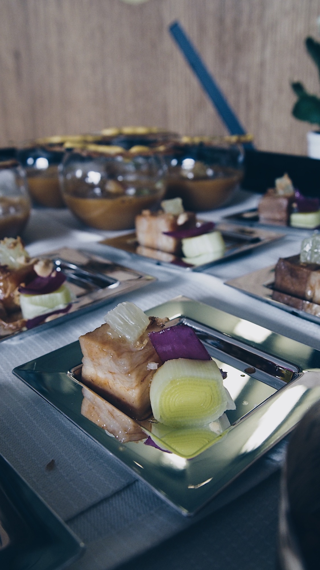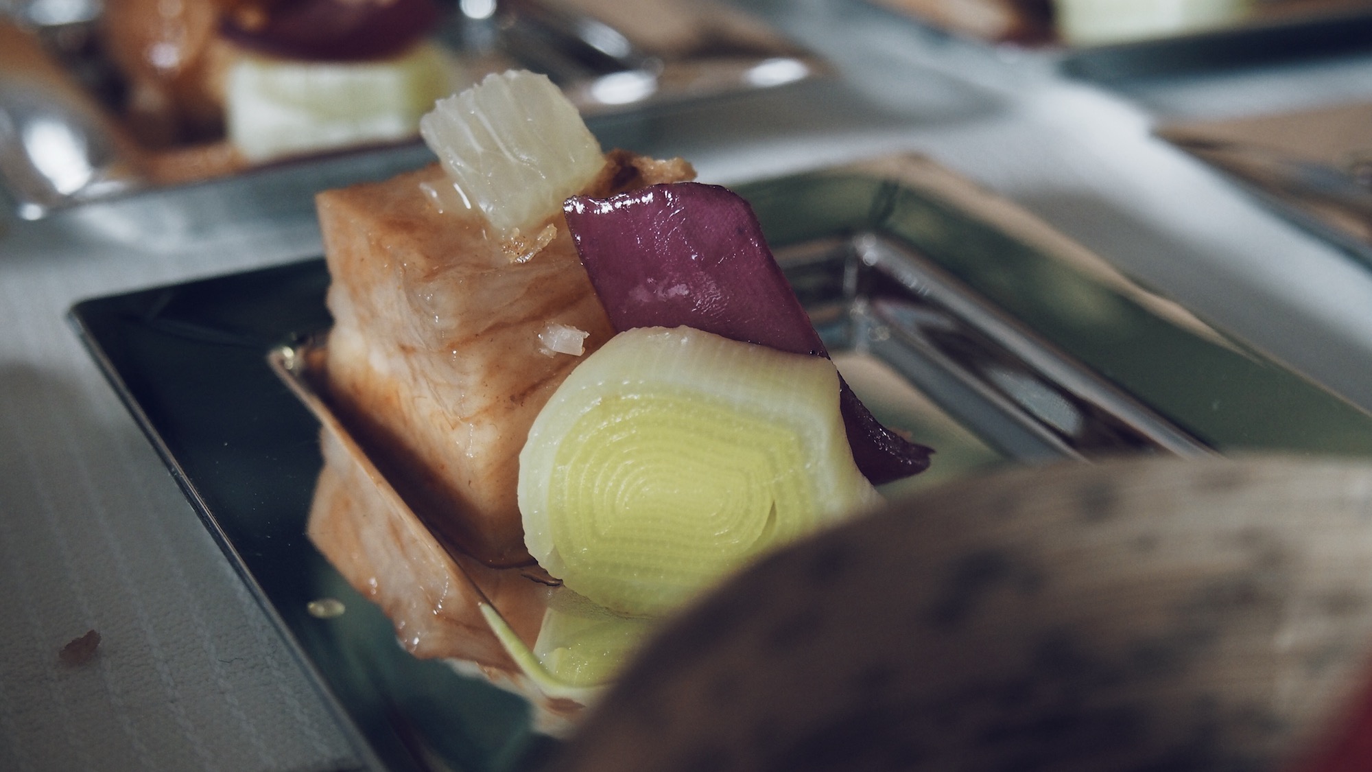 Céleri rave et granny smith en velouté, copeaux de haddock fumé, coppa sur une tartine relevée à la fêta et tomate confite, panais entre deux ravioles, encornet, maquereau …