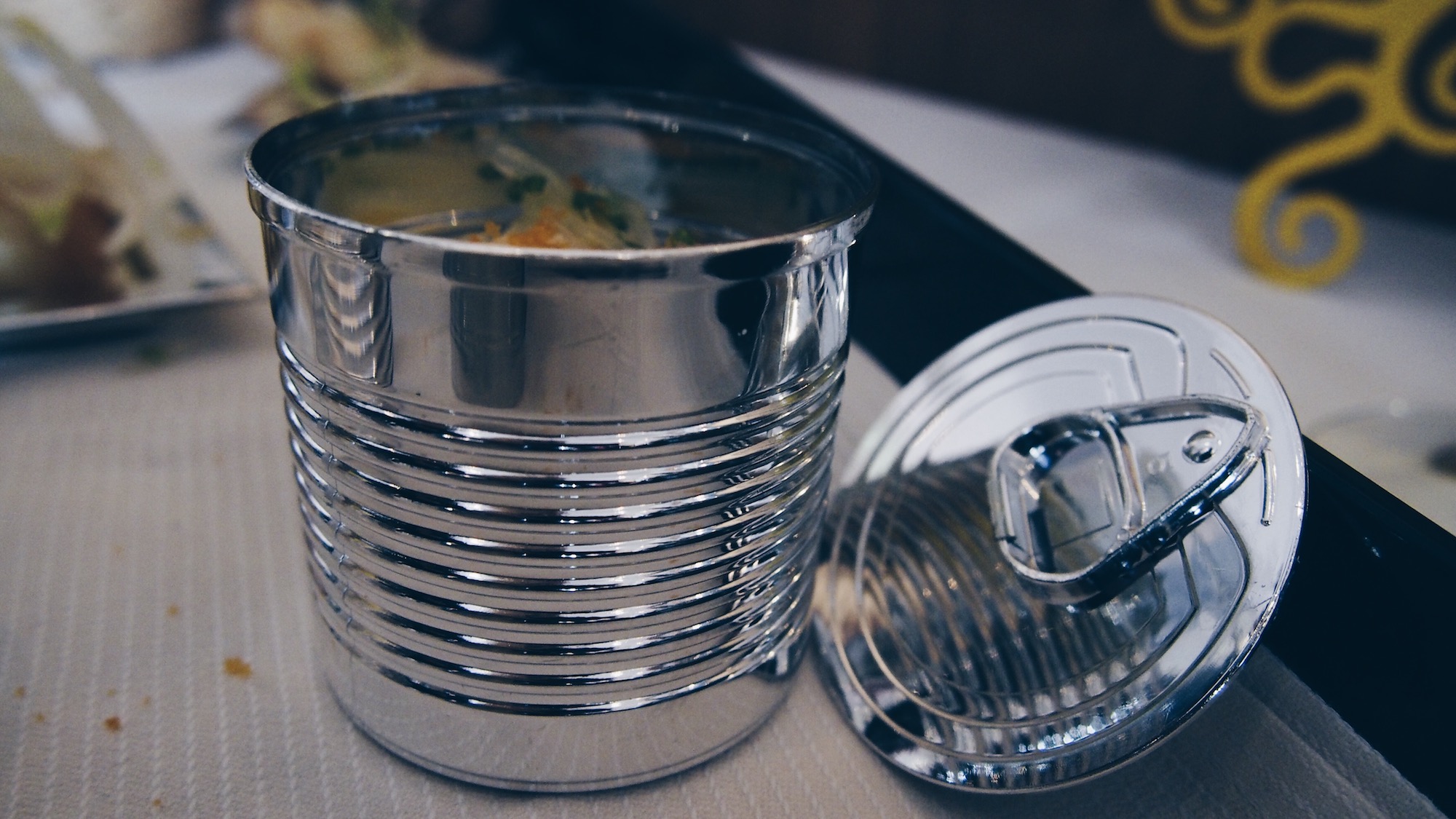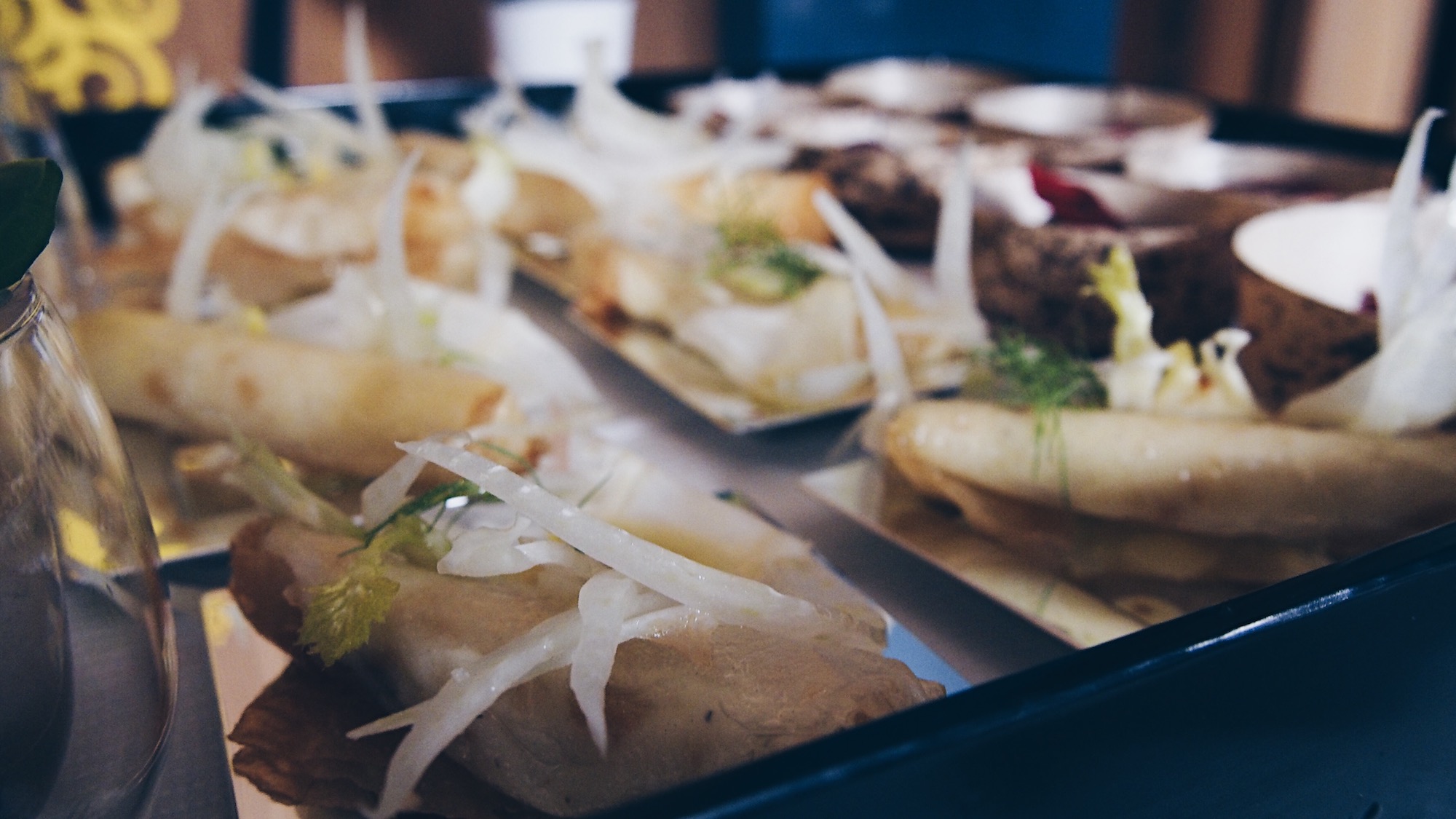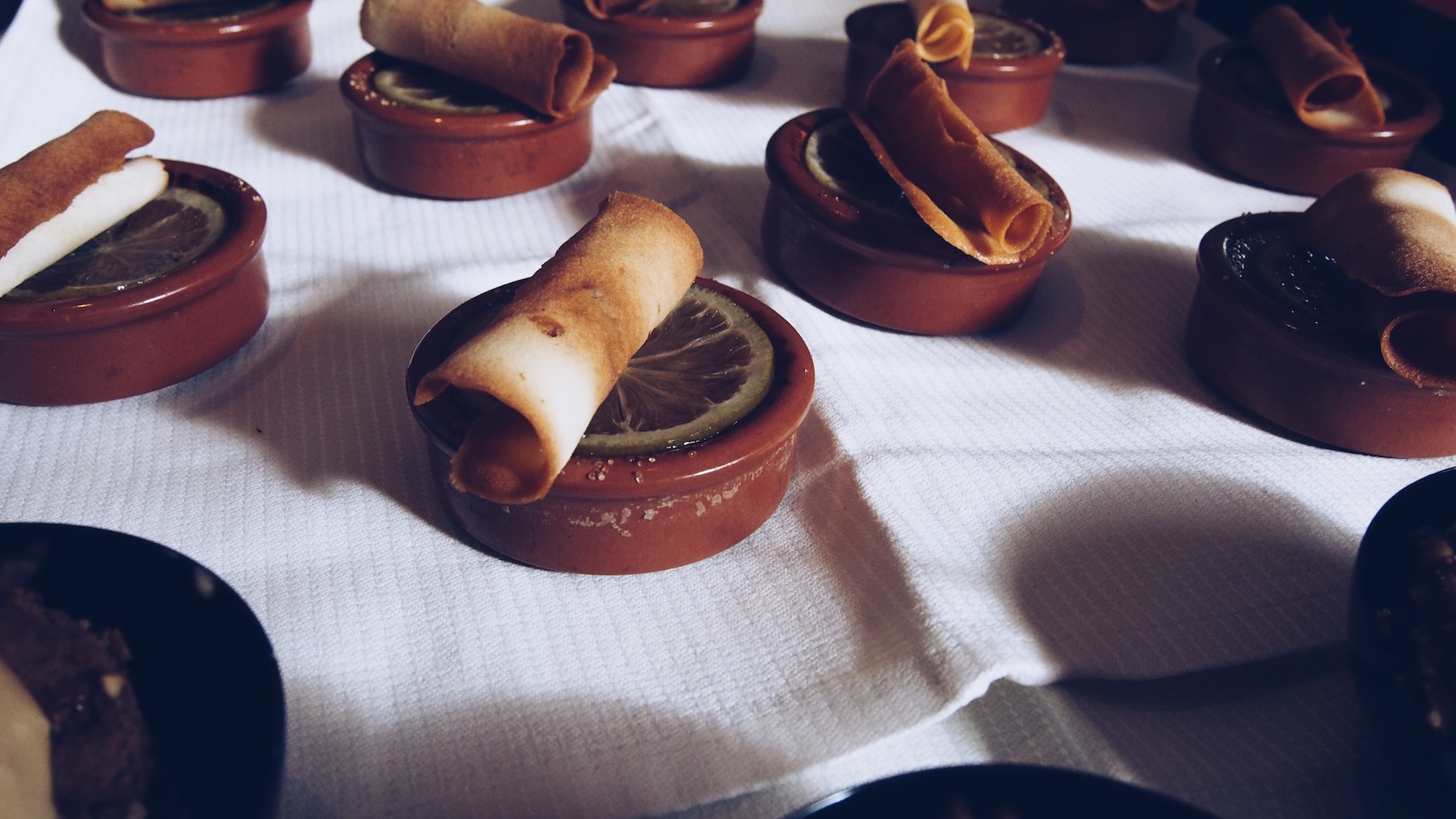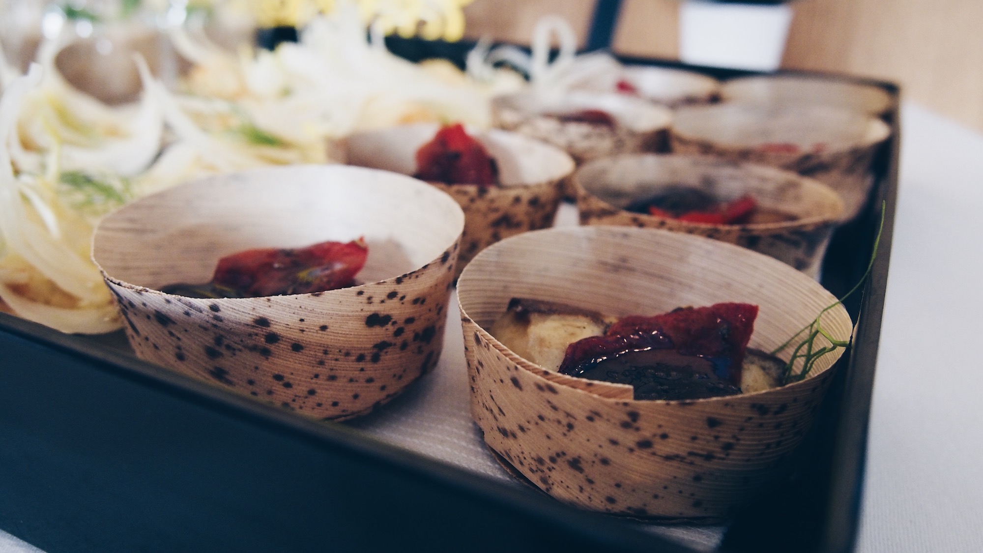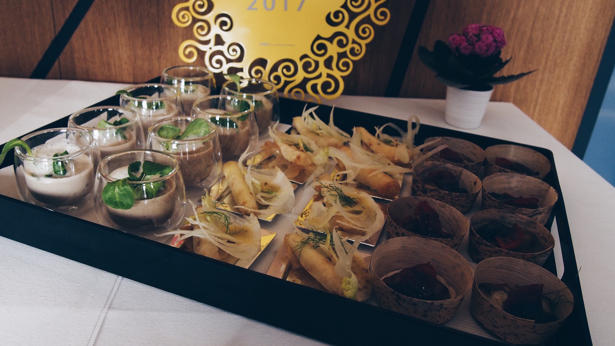 Céleri rave et granny smith en velouté, copeaux de haddock fumé, coppa sur une tartine relevée à la fêta et tomate confite, panais entre deux ravioles, encornet, maquereau …