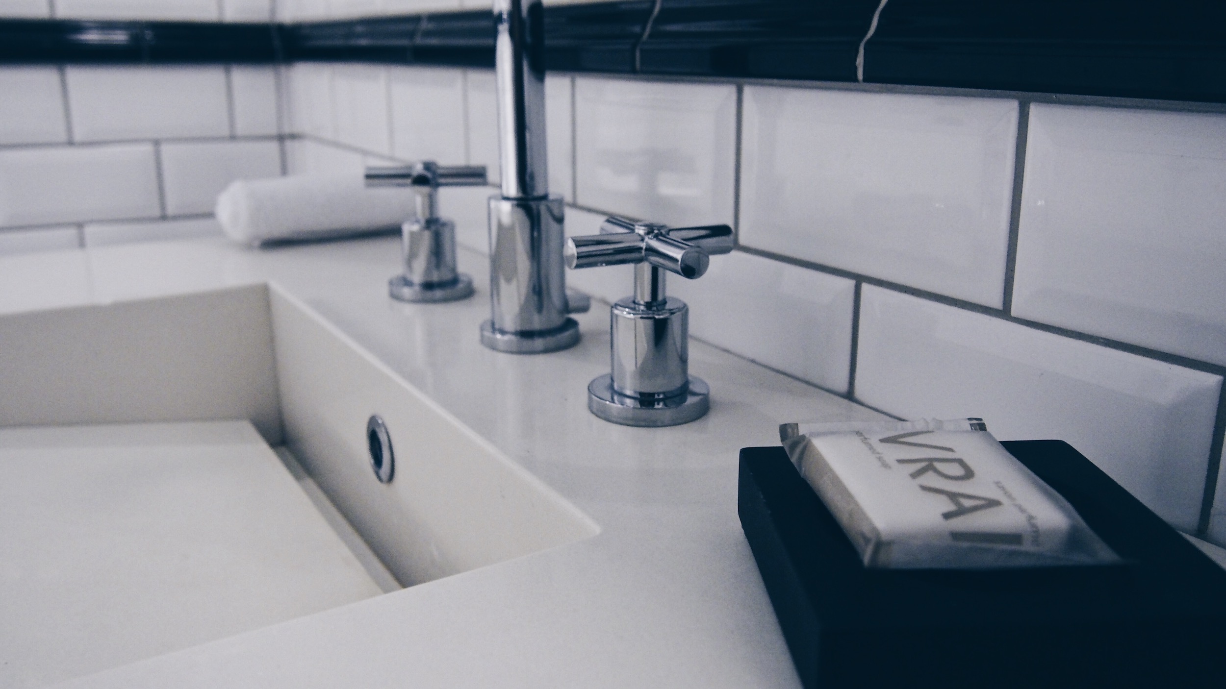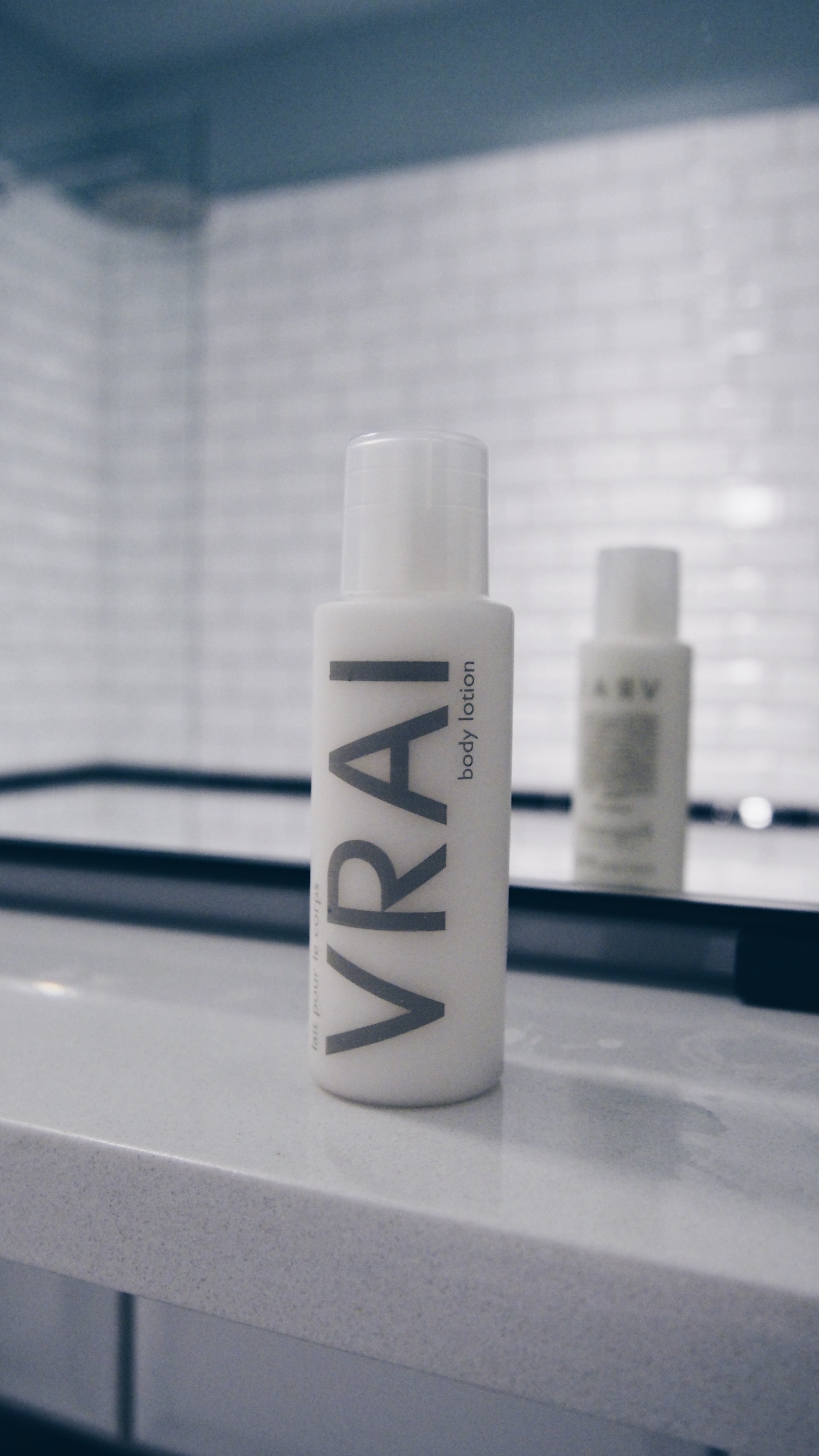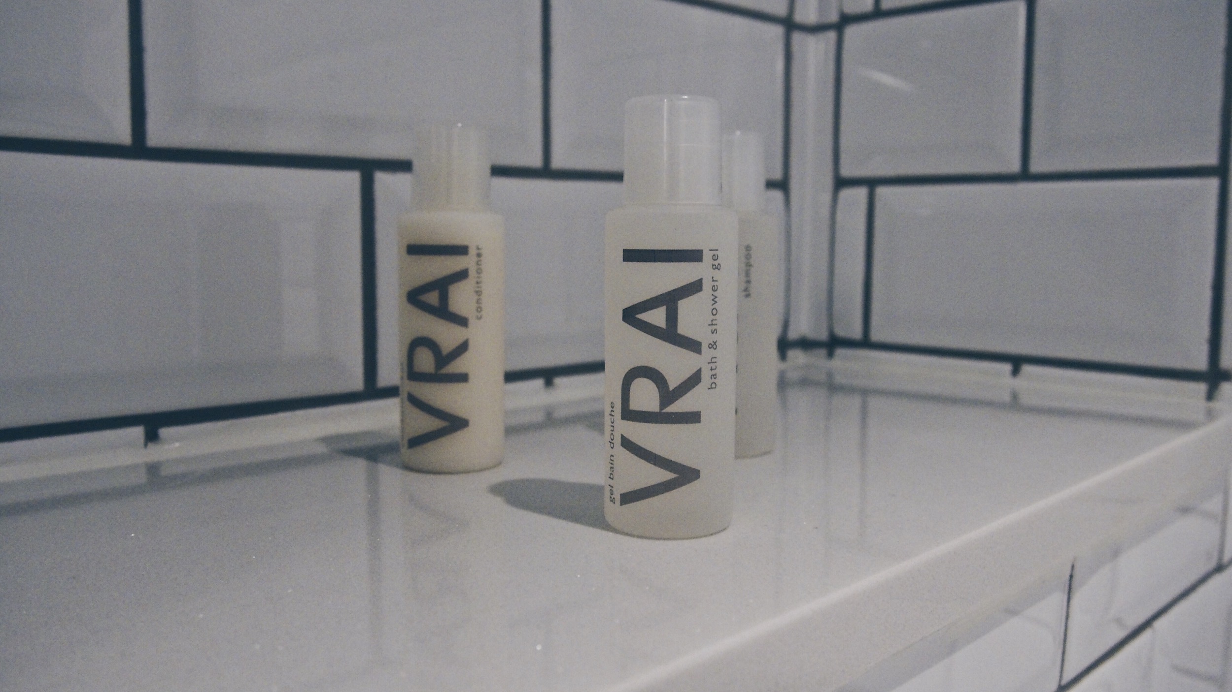La salle de bains est fonctionnelle, d’un blanc presque immaculé et agrémenté de produits VRAI de la marque Fragonnard.