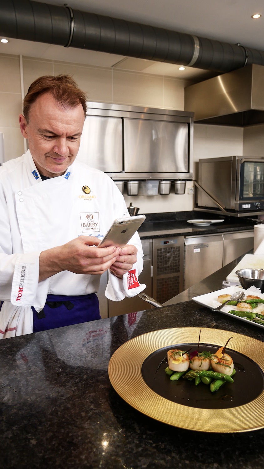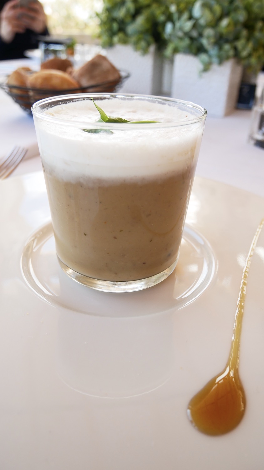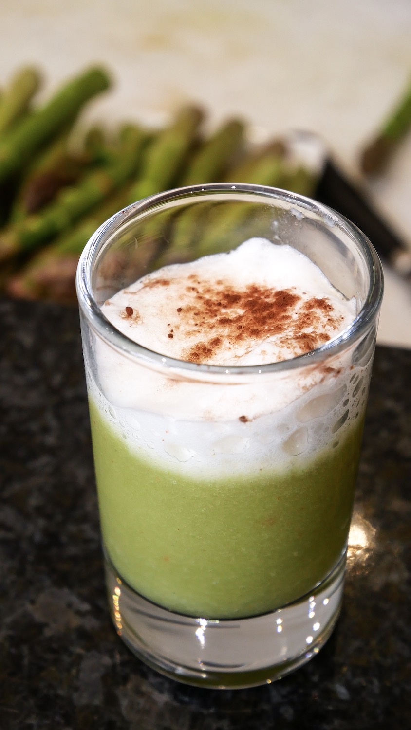 Il nous a partagé une de ses astuces anti-gaspillage. Utiliser la partie dure des asperges (cuites à l’eau salée) et les mixer pour obtenir une sorte de velouté. Une petite mousse de lait et voilà un cappuccino salé saupoudré d’un soupçon de poudre de cacao.
